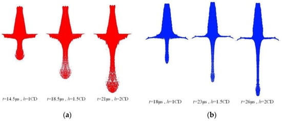 Different from traditional metal materials, reactive composites are often formed by cold pressing, and their sound velocity is much lower than that of traditional metal materials. Therefore, during the formation process of the reactive composite jet, the jet will expand and disperse, forming a particle stream composed of high-speed moving micro-elements. The typical formation process of the reactive composite jet at different times is shown in Figure 2a. For comparison with the reactive composite jet, the formation process of the Cu jet is also calculated, and the corresponding formation process is shown in Figure 2b, where h is the stand-off.