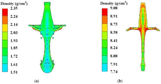 The jet density distribution at 2.0 CD standoff: (a) Reactive composite jet and (b) Cu jet.
