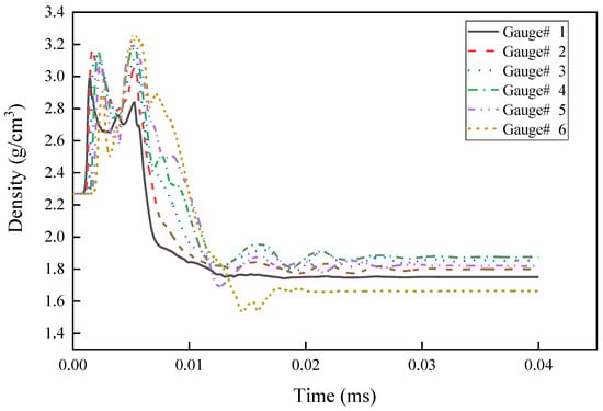 The curve of the reactive composite jet density at the axis changes with time as shown in Figure 5. Gauss points 1–6 are arranged in sequence from outside to inside along the top axis of the liner. Under the detonation pressure, the axis density of the reactive liner increases rapidly from outside to inside, forming the first density peak. Subsequently, the reactive liner is crushed and deformed toward the axis position under the detonation wave, gradually forming the reactive composite jet, and the density of the top of the reactive liner rises again under the crushing action, forming the second density peak shown in Figure 5. Then, the reactive composite jet tip is formed. During the formation process, the density of the reactive composite jet drops rapidly, and an expansion effect occurs. However, for the Cu jet, due to the good cohesiveness maintained, the density at different positions of the jet tip and the slug are all above 8.0 g/cm3. In terms of the velocity gradient, under the condition of the same mass, the reactive liner has a higher tip velocity than the Cu liner due to its lower density while the axial velocity gradient of the reactive composite jet is larger than that of the Cu jet, and the reactive composite jet tip has a larger radial velocity, which leads to the radial expansion effect of the reactive composite jet tip.