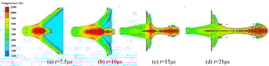 Figure 6 shows four typical transient temperature field diagrams during the reactive composite jet formation process. Figure 6a shows that under the action of the detonation product, the reactive composites move to the axis of symmetry and then collide. Meanwhile, the temperature of the collision area near the axis of the jet tip is the highest. At this time, the temperature of the liner is relatively high at the top and low at the bottom. Moreover, it can be found that the temperature of the outer wall of the liner rises first due to its proximity to the explosive, and then the temperature of the inner wall increases significantly when the inner wall collides at the axis. In Figure 6d, the axis collision has ended, the temperature distribution inside the jet and the slug tends to be uniform, and the outside temperature of the two wings is higher, because they are still affected by the detonation products at this time. With the movement of the jet, it enters a free state, thus the pressure and temperature drop gradually. As time progresses, the pressure further decreases while the temperature hardly changes.