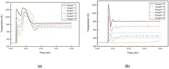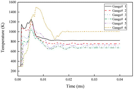 The temperature time–history curves of the particles at the axis of the reactive liner are shown in Figure 7. The charge detonates at t = 0 μs. Subsequently, the reactive liner heats up under the action of the detonation wave, forming a temperature peak, and the inner wall of the liner is crushed and closed at the axis. The temperature of the inner wall continues to rise under crushing collision, and the entire temperature rise process lasts approximately 5 μs. The temperature of the inner wall reaches the highest peak at 7.5 μs after detonation of approximately 1450 K, and then the particle temperature at the top axis of the liner begins to gradually decrease and stabilize.