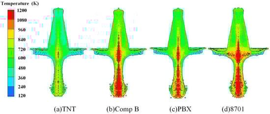 Figure 9 also shows that the temperature of most elements from the jet tip to the junction of the jet and slug is higher than 800 K when the explosive is 8701. When the charge is Comp B or PBX, which has a lower detonation pressure, elements with temperatures that exceed 800 K partially decrease compared with that of 8701. The jet driven by TNT charge attains the maximum temperature at the axis of its tip without reaching 800 K. TNT is a relatively ideal explosive considering only the jet shape and temperature distribution of the reactive composite jet. It should be noted that the tip velocity, condensability, and temperature distribution of the reactive composite jet share a comparably significant influence on the penetration effect in practical engineering applications. Certain application requirements should be considered when choosing an explosive.