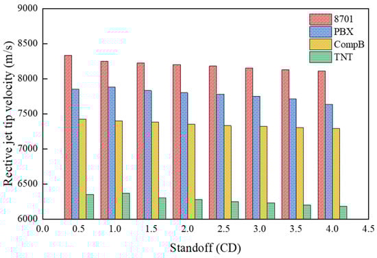Figure 10 presents the velocity distribution of the reactive composite jet with different explosive types. As shown in Figure 10, the tip velocity of the reactive composite jet increases with the increase in the explosive detonation pressure. The tip velocity of the reactive composite jet driven by 8701 reaches a maximum value of 8330 m/s while the velocity of the reactive composite jet tip driven by TNT only reaches 6370 m/s, which is much lower than the others.