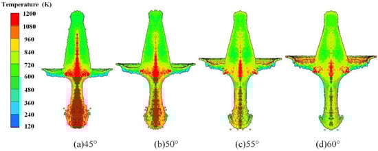 The cone angle of the reactive liner is one of factors that has a significant influence on the jet formation characteristics. Studies have indicated that a small cone angle leads to a high jet tip velocity while the effective mass of the jet decreases. Conversely, by increasing the cone angle, the jet tip velocity decreases while the effective mass of the jet increases. Simulation of reactive composite jets’ formation at different cone angles was carried out to show how the cone angle affects the reactive composite jet formation characteristics, including 45°, 50°, 55°, and 60°. The interior temperature distribution of the reactive composite jet at different cone angles at 1.0 CD standoff is shown in Figure 11. Figure shows a decrease in the temperature gradient of the reactive composite jet as the cone angle increases. More specifically, when the reactive liner cone angle is 45°, the high-temperature area of the reactive composite jet is most widely distributed, which almost covers the entire jet tip and the junction of the jet and slug. When the cone angle gradually increases to 60°, the high-temperature area is found at the axis of the tip and the junction of the jet and slug.