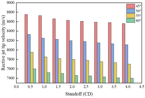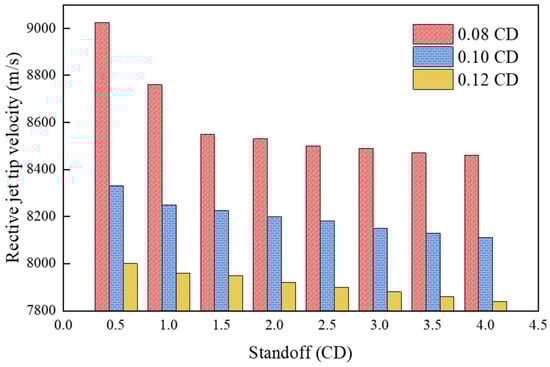 Figure 14 shows the velocity distribution of the jet tip influenced by the liner thickness. The velocity of the jet tip gradually decreases with increasing liner thickness. When the thickness is 0.08, 0.10, and 0.12 CD, the jet tip velocity reaches a maximum value of 9025, 8330, and 8000 m/s, respectively. It can also be seen that by increasing the liner thickness, the velocity of the reactive composite jet tip decreases slower when the standoff increases.