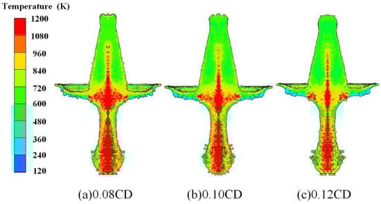 The temperature distribution of the reactive composite jet with different liner thicknesses at 1.0 CD standoffs is shown in Figure 13. There is a gradual decrease in the high-temperature region inside the reactive composite jet as the liner thickness increases. The whole jet tip and the junction region between the jet tip and slug is almost in the high-temperature area when the liner thickness is 0.08 CD while the high-temperature area covers half of the area of the jet tip and the junction between the jet and slug when the liner thickness is 0.12 CD. Note that the reactive composite jet formation by different liner thicknesses shares a similar divergence at the jet tip, although the reactive composite jet still does not agglomerate.