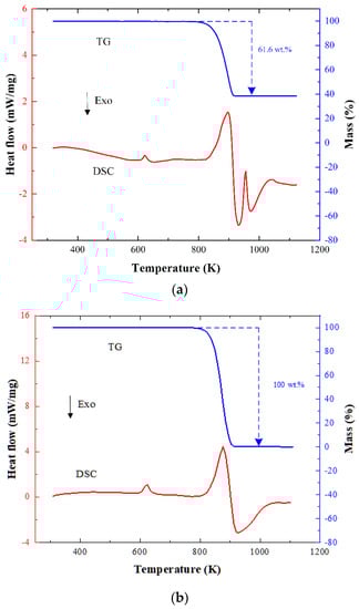 PTFE is a complex semi-crystalline material with the chemical formula—(CF2-CF2)—which has great stability and chemical inertness at room temperature. To better understand the thermal decomposition and reaction process of PTFE/Al reactive composites, the chemical thermal reaction behavior of 73.5 wt.% PTFE/26.5 wt.% Al mixture and pure PTFE was investigated using DSC/TG experiments. The experiment was carried out from room temperature to 1120 K (850 °C) in an argon atmosphere, and the heating rate was 20 K/min. In the reaction process of PTFE/Al reactive composites, PTFE first decomposes to release C2F4. With the passage of time, the Al particles in the powder react with the fluoropolymer, releasing many reaction heat and gas products. In an anoxic system, the main reactions are as follows: