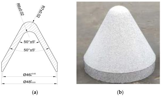 The preparation process of the reactive liner used in the experiment mainly consists of 3 steps: at first, the reactive material powder with 73.5 wt.% PTFE and 26.5 wt.% Al was preliminarily mixed. The average size of the PTFE and Al particles was 100 and 44 μm, respectively. The preliminarily mixed powder was mixed in the planetary centrifugal mill for 3 h and the fully mixed powder was placed in an 82 °C vacuum drying oven for about 24 h. Then, 49.1 g of reactive material powder were weighed and put into the mold. The mold was pressed for 30 s at a pressure of 300 MPa and placed to eliminate residual stress. Finally, the pressed reactive liner was placed in a nitrogen-filled sintering furnace for sintering. Specifically, the sample was heated at a rate of 50 °C/h in the sintering furnace, and when the temperature was increased to a maximum temperature of 380 °C, the sample was sintered at 380 °C for 6 h. Then, the temperature was cooled at a rate of 50 °C/h. When cooled to a maximum temperature of 310 °C, it was sintered at 310 °C for 4 h, and then cooled down to room temperature with the furnace [16]. The reactive liner is shown in Figure 16.