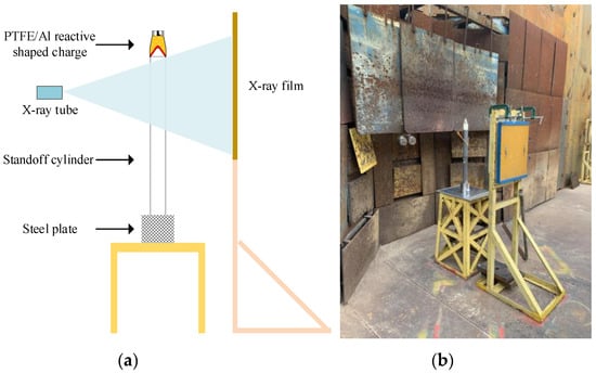 The reactive shaped charge used in the experiment consists of a reactive liner, a main charge 8701, a case, and a detonating device. When the main charge is detonated, the detonation wave propagates in the main charge along the axial direction, and then the detonation wave acts on the outer wall of the reactive liner, and the liner collapses toward the axis to form the reactive composite jet and a slug. As time progresses, the penetrator will continue to elongate and become a longer reactive composite jet at a velocity generally between 7000 and 8500 m/s. The experimental principle and site layout of the reactive composite jet formation pulse X-ray are shown in Figure 18.