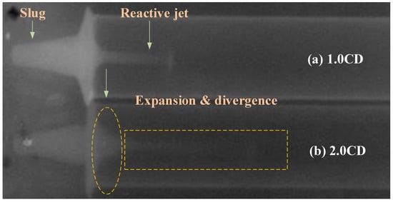 The typical reactive composite jet formation behavior is shown in Figure 19. Taking the detonation time of the main charge as 0 μs, pulse X-rays were taken at 2 moments of 15 and 21 μs. The jet tip shows different degrees of divergence and expansion effects at two moments. Figure 19a shows that the tip of the PTFE/Al reactive composite jet reaches approximately the position of 1.0 CD standoff, and the corresponding tip velocity of the reactive composite jet is approximately 8200 m/s. At this moment, under the detonation driving action of the main charge, a reactive composite jet with an excellent performance can be formed by the reactive liner. The reactive composite jet tip and slug shape are relatively clear, and the jet continuity and coaxiality are also good. Moreover, the slug is larger, the shape is clearer, and the imaging color is brighter. This indicates that most of the mass of the reactive liner forms part of the slug, leading to higher density and compactness. Compared with the slug, the reactive composite jet has a lighter color, which is caused by the expansion of the jet tip during the formation process, which is consistent with the calculation results of the numerical simulation. It should be noted that the higher the density of the reactive composite jet, the brighter the color and the clearer the contour in the X-ray image.