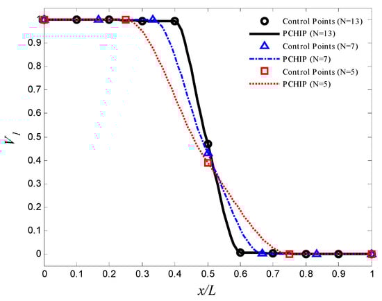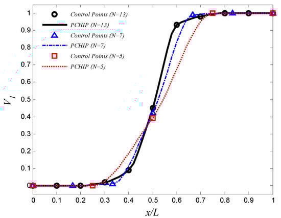 where L is the length of the cylinder, and x is the axial coordinate (0 ≤ x ≤ L). , ,, and are the design variables used to control the volume fraction profile. These parameters are chosen such that 0 ≤ V1(x) ≤ 1. Note that . In addition to these laws, this work suggests using control points method for optimization problems. In this method, the volume fraction profile is controlled by the volume fractions at some control points that are distributed evenly through the length of the cylinder. The location of ith control point, along the cylinder length, is in which is the number of control points. The volume fraction distribution in the cylinder, , can then be estimated by the piecewise cubic hermit interpolating polynomial (PCHIP) [41,42]. The design variables in this case are , , …, .