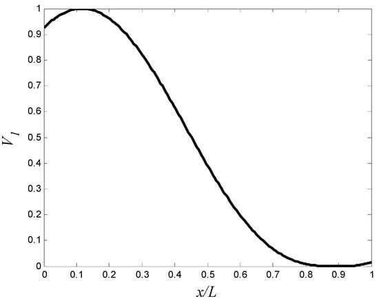 In this problem, we use different number of control points and . The volume fractions of the first material, , are estimated by the piecewise cubic hermit interpolating polynomial (PCHIP) [41,42]. A GA is employed to obtain the optimal design parameters . In each generation of optimization process, the number of the population is 150. The optimization process stops when the change in the frequency is less than 10−2. The optimal volume fractions at the control points are summarized in Table 6, and the corresponding aluminum volume fraction distribution is shown in Figure 4. The maximum fundamental frequency is resulted by using 11 control points. The maximum fundamental frequency of the axially FGM cylinder is 29.39 Hz, which is more than the fundamental frequencies of aluminum and zirconia cylinders by 56.0% and 36.4%, respectively. To reduce the computational efforts that resulted from the high number of design variables and the interpolation method, a trigonometric law (Equation (2) is proposed to describe the volume fraction distribution in the optimization process. In this law, there are four design variables only (i.e., and ). The design variables must be carefully selected to ensure that . The constraints are assumed as , , and . In this case, the number of the population in each generation is assumed to be 40. The optimal design parameters in Equation (2) are listed in Table 6, and the corresponding aluminum volume fraction distributions are shown in Figure 5. The maximum fundamental frequency is 28.60 Hz, which is greater than the fundamental frequency of aluminum and zirconia cylinders by 51.8% and 32.8%, respectively. Figure 4 and Figure 5 show that assigning the stiffer zirconia near the support (i.e., high bending moment region) and the lighter aluminum near the area of high modal displacement increases the fundamental frequency.
