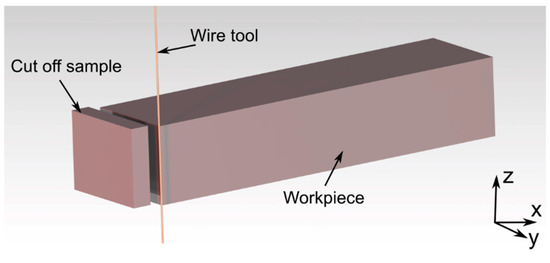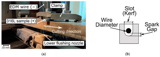 The WEDM process was carried out using BP95d electro-erosion cutting machine (Zakład Automatyki Przemysłowej B.P., Końskie, Poland). The sample mounted is shown in Figure 3a, while the outline of the machining area—in Figure 3b. The process consisted in cutting basic samples (made in SLM and casting processes) into pieces—cut off samples with dimensions of 1 mm × 5 mm × 4 mm. Length of the cut was 5 mm. In the case of SLM sample, cutting process was performed in the direction perpendicular to its layers. Exact method of cutting the samples is shown in Figure 4.