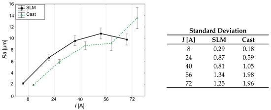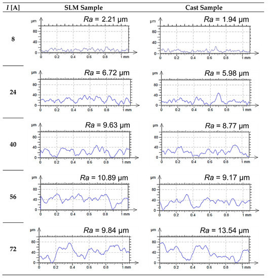 Significant differences in the Ra roughness parameter were observed between the samples for high current values. In the range of I = 56 ÷ 72 A, the casting is much more sensitive to increase in this parameter. Changing the current from 56 to 72 A causes an increase in Ra value by 30%, up to about 14 µm. On the contrary, the SLM maintains the Ra at a constant level of about 10 µm. For current of I = 72 A, Ra values for the SLM sample were about 25% lower compared to the cast one. It indicates that relatively good surface quality, as well as improved process efficiency, can be obtained while processing material made by means of SLM. Such an effect is not achievable for the cast sample, which proves the benefit emerging from using the SLM method.