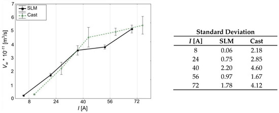 Analysis of the results in terms of WEDM process volumetric efficiency (Vw) correctly indicates an increase in this parameter with an increase in the applied current amplitude (Figure 7, Table 6 and Table 7). It should be noted that during the processing of the SLM workpiece with the current value of I = 72 A, maximum volumetric efficiency of the process is obtained (about 5 × 10−11 m3/s), and still the surface roughness of Ra ≤ 10 µm is maintained. Surface roughness analysis did not explain why the roughness obtained when using 72 A current is at a similar level as in the cases of 40 A and 56 A. Either way, the values obtained suggest that the use of SLM technology has an effect on the quality of the final surface, which is a product of WEDM post-processing.