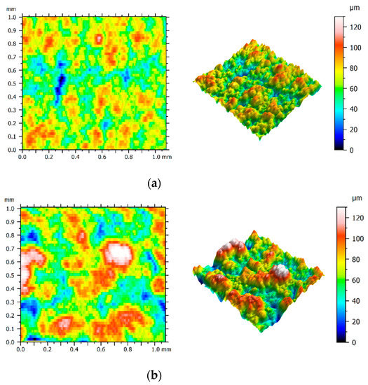 In the case of the SLM sample, the Ra parameter values obtained for the current of I = 72 A were at the level of those obtained for I = 56 A. Three-dimensional representations of the surfaces made using these two current values are presented in Figure 9a,b. On the basis of the attached figures, it can be concluded that despite a significant difference in the applied current (16 A), both surfaces have a similar range of roughness. For comparison purposes, structures of the cast sample surfaces produced using the current of I = 56 A and I = 72 A are presented in Figure 10a,b, respectively.