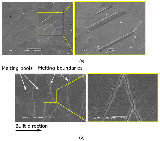 SEM pictures presenting the initial structures of the cast and the SLM samples are shown in Figure 11a,b, respectively. Both types of analyzed samples, regardless of their manufacturing process, had an austenitic structure. In the case of 316L solid steel (Figure 11a), the microstructure consists of equiaxed austenite grains with visible glow (recrystallization) twins, which were formed after the annealing process [39]. In the case of the SLM sample, cellular microstructures related to rapidly solidified austenitic stainless steel are observed [39], which indicates a directional nature of heat propagation during the manufacturing process (Figure 11b). Melting pools and melting boundaries appear within the structure of the SLM sample, and the microstructure is characterized as non-homogeneous [40].