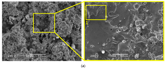 SEM images of top view for cast samples (a); magnification of point 1 (b); for using I = 72 A.