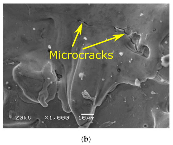 Further analysis allows observing defects characteristic for EDM treatment, such as microcracks or the presence of debris (Figure 13 and Figure 14). When comparing the samples, it can be seen that a greater number of microcracks appear on the surface of the SLM sample, which is due to its greater hardness. According to [38], components made of 316L steel by means of SLM have higher hardness than castings. As a result, they are also more prone to cracking and chipping processes.