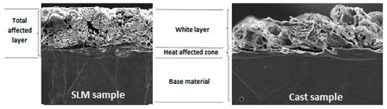 Cross-sections and schemes of the subsurface layers for SLM and cast samples.
