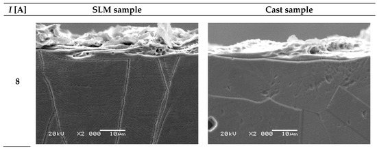When analyzing the top views of both samples, it can be clearly seen the white layer structure for the cast sample is rougher. This is clearly visible in the SEM photos for the case of using a current of 72 A (Figure 12). It can also be seen that in the case of a casting surface, irregularities extend beyond its edge. On the other hand, the edge of the SLM sample is straight, which indicates its more condensed structure and also proves better shape accuracy.