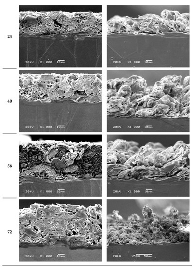 For the needs of the surface layer analysis, detailed SEM images were taken. They present top views of the treated surfaces as well as cross-sections of the machined samples.