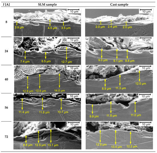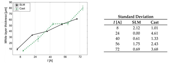 Based on the white layer thickness measurement results presented in Figure 17 and analyzed in Table 8 and Table 9, it was found that as the current value increases, its thickness also increases, regardless of the type of material. This dependence is due to the fact that an increase in the current brings more energy to every single electrical discharge, thus causing an increase in the amount of heat acting on the treated surface. With a greater amount of heat, changes in the material structure occur to a greater extent. As for the cast sample, with a current value of I = 72 A, a sudden increase in this value (over 20% compared to that achieved with a current of 56 A) is observed. In the case of SLM samples, the thickness of the white layer gradually increases over the entire range of currents used.