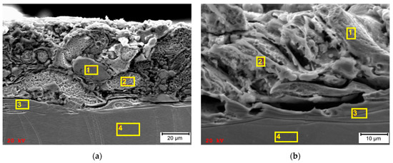 SEM images of total heat-affected zone with designation of specific EDS surface analysis areas: (a) SLM sample; (b) cast sample.