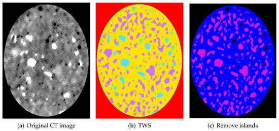 XCT image after processing and segmentation. Limestone area: (a) grey, (b) purple and (c) purple; Sand (or small stone) area: (a) white, (b) blue and (c) purple.