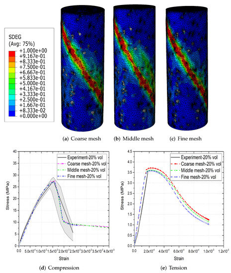 Full mesh sensitivity results of parametric models can be found in a previous study by the authors [31]. The effect of mesh size on image-based concrete models is investigated in this section. Figure 5a–c show three different meshes of concrete model with 20% aggregate content. The effect of mesh size on concrete failure patterns under compression are observed to be insignificant. Similar is the results under tension. Figure 5d,e further illustrate that mesh size have negligible effect on stress–strain curves of image-based concrete models under both compression and tension. The coarse mesh has 393,157 nodes and 2,284,750 elements, while the fine mesh has 465,160 nodes and 2,707,451 elements. The CPU time of model with coarse mesh is much more efficient than fine mesh model, especially under compression [31]. In this case, models with coarse mesh are used for the following simulations. The same mesh quality is used for parametric models.