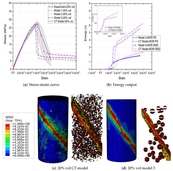 (a) Stress-strain curves, (b) energy output and (c,d) crack patterns of 20% vol parametric and CT concrete models under compression [31].