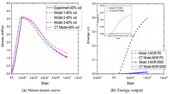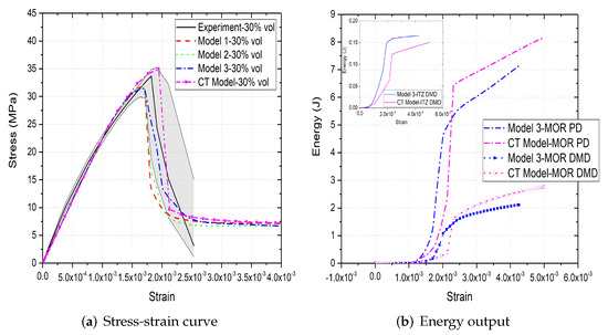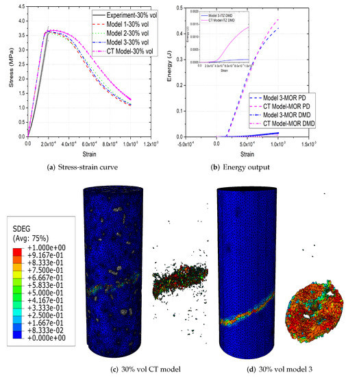 (a) Stress-strain curves, (b) energy output and (c,d) crack patterns of 30% vol parametric and CT concrete models under compression [31].