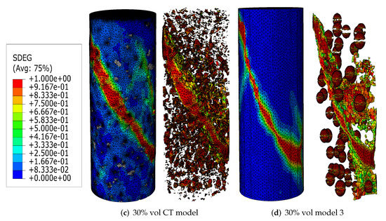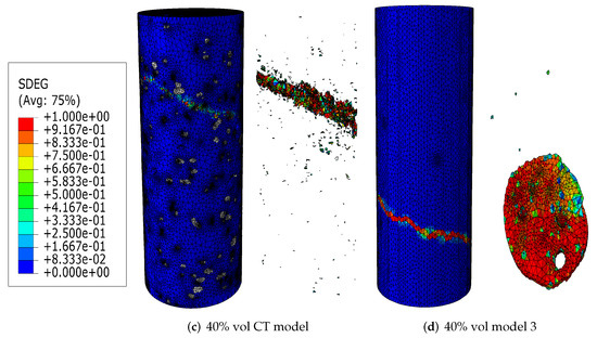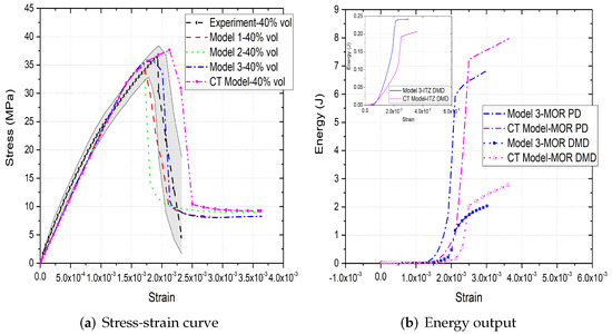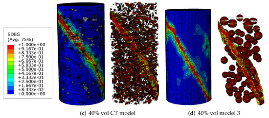 Figure 6a,b, Figure 7a,b and Figure 8a,b compare the compressive stress–strain results and energy dissipation of concrete with 20, 30 and 40% aggregate volume fractions, while Figure 6c,d, Figure 7c,d and Figure 8c,d illustrate the corresponding failure patterns. Note that the aggregates may seem to obstruct each other in a 2D image of a 3D model. Additionally, the real aggregates are not perfect spheres, but more close to ellipsoids or polyhedrons. Therefore, the number of aggregates in image-based meso-structure is larger than that in synthetic one with the same aggregate volume fraction, which leads to denser packaging of aggregates in image-based concrete model. However, the size distribution of both synthetic and natural aggregates matches the prescribed values. Both of the peak strength and critical strain at peak strength of image-based and parametric models have good agreement with experimental results in all concrete types. The pre-peak region of image-based model with 20% aggregate content agrees well with that of parametric model. However, the peak strength of image-based model is 11% and 6% larger than that of parametric model for 30% and 40% concrete, respectively, which is observed by [12,55], while the critical stain is 13% larger for both. One possible reason is that the natural aggregates have irregular shapes. Additionally, the post-peak softening region and residual stress of image-based and parametric models agree with each other.