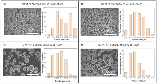 Morphology and size distribution of mixed powders. (a) 10 wt.% 15–25 μm powder + 90 wt.% 38–45 μm powder. (b) 30 wt.% 15–25 μm powder + 70 wt.% 38–45 μm powder. (c) 70 wt.% 15–25 μm powder + 30 wt.% 38–45 μm powder. (d) 90 wt.% 15–25 μm powder + 10 wt.% 38–45 μm powder.