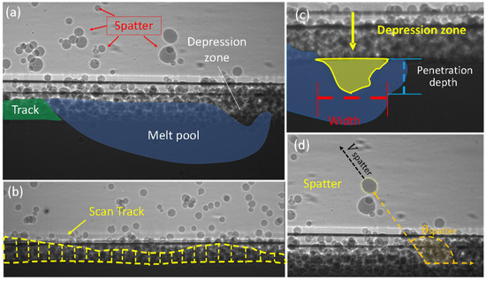 Selective laser melting dynamics. (a) A representative X-ray image acquired by high-speed X-ray imaging with depression zone, melt pool, spatter, and scan track highlighted. (b) Post-scan X-ray image with the location and geometry of melted scan track marked. (c) X-ray image with depression zone geometry indicated. (d) X-ray image with the spatter direction and velocity indicated.