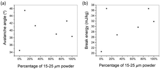 Avalanche angle and break energy. (a) Avalanche angle of powder samples with different percentages of 15–25 μm powder. (b) Break energy of powder samples with different percentages of 15–25 μm powder. Peaks are observed at the designed samples with efficient powder packing.