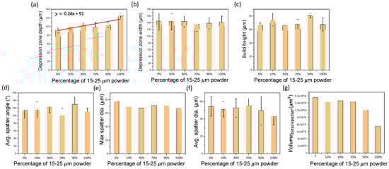 Figure 7a,b depicts the change in the depression zone depth and width due to varying the mixing ratio of small (15–25 μm) and large (38–45 μm) powders. An upward slope of 0.26 was observed as the percentage of small powder increases. The trend is due to the change in powder size, as the large powder requires greater energy input to melt and fuse powders to the substrate during scanning. The cause for the increased energy input is due to the reduction in laser absorption of the powder bed as the size of the powder increases, which is attributed to the decrease of multi-reflection induced absorption in the powder layer [30]. The depression zone width was not significantly affected by the powder size distribution.