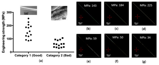 Manual sorting of fibers based on clearly visible different birefringent properties. (a) Plot of experimentally determined strength values for two categories of fibers. Insets: representative SEM images of fibers categorized as good and bad, respectively. (b–d) Representative POM images of fibers manually categorized as good. (e–g) Representative POM images of fibers manually categorized as bad. The orientation of the polarizers relative to the fiber is indicated by red double arrows. Insets: strength values of the fibers shown.