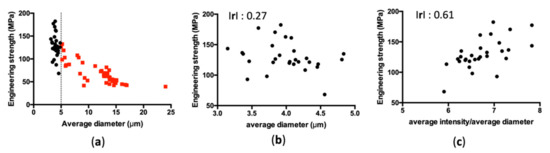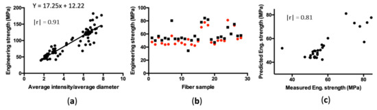 Sorting fibers based only on the size and the effect of also considering birefringence. (a) Engineering strength plotted against average fiber diameter. Fibers with a diameter larger than 5 µm are shown as red solid squares. (b) Average diameter plotted against engineering strength for fibers of a diameter < 5 µm. (c) Average intensity normalized to fiber diameter plotted against engineering strength for the fibers in Figure 3b. Insets: correlation coefficient values.