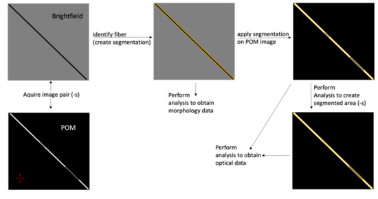 Schematic drawing of the workflow for the semi-automated image analysis process. A pair of light microscopy images of a fiber—one obtained in bright field mode and one with crossed polarizers—is acquired, followed by an automated image analysis to generate data on the fiber regarding morphological and optical characteristics. The bright field image is then utilized for determining the border of the fiber and performing a segmentation resulting in a binary mask (outlined in yellow). Multiple sequential image pairs can be acquired to cover longer fiber sections and subsequent image analysis is performed.