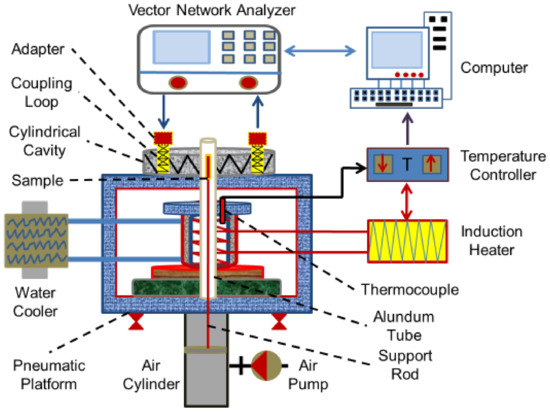 The interaction between microwave and the heated material is expressed by complex permittivity [35,36]. The resonant cavity perturbation method is widely used in the measurement of the complex permittivity of solid and liquid materials [37,38]. The more detailed information about the measurement principle of the resonant cavity perturbation method was provided in Supplementary Materials. The schematic diagram of high-temperature permittivity measurement system is displayed in Figure 3. The test system mainly included vector network analyzer, cylindrical cavity, coupling device, waveguide coaxial conversion head, electromagnetic induction heater, quartz sleeve, sample lifting platform, circulating cooling system, and computer software system. The overall technical indicators of the permittivity measurement system were as follows: the service temperature ranged from 0–1000 °C; the microwave frequency is 2450 (±50) MHz; the test value regime covered 1–100 of dielectric constant (εr′) and 5 × 10−3 − 1 of loss tangent coefficient (tan δ).