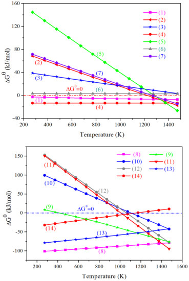The main reactions probably appeared in the calcium-activated residues is presented in Table 2. The dependence of ∆Gθ for the main reactions in the calcium-activated residues on temperature is depicted in Figure 4, wherein the thermodynamic data were calculated by HSC Chemistry thermochemical software. As illustrated in Figure 4, the reaction of ZnS(s) + CaO(s) = ZnO(s) + CaS(s) can hardly react within the temperature range of 0–1200 °C, but it can be seen from Table 2 that ZnS can undergo oxidation reaction (reaction NO. 8) at room temperature. Additionally, it is found from the comparative calculation of the carbothermal reduction reaction conditions that the addition of C reducing agent for the reaction of ZnS(s) + CaO(s) = ZnO(s) + CaS(s) can achieve the conversion of ZnS to ZnO (reaction NO. 7). However, the transition temperature is higher than 1000 °C. Similarly, the reaction transition temperature for Zn2SiO4(s) + C(s) is also above 1000 °C (reaction NO. 5); while the reaction transition temperature of ZnFe2O4(s) + C(s) is relatively lower than that of ZnS and Zn2SiO4, with the transition temperature of 550–950 °C (reactions NO. 9–13). Moreover, it is concluded that during the carbothermic reduction reaction of ZnFe2O4 phase, ZnO can be reduced in a metallic state by C and CO ingredients (reactions NO. 2–3). The volatilization of zinc in gaseous form is not conducive to the centralized recovery of zinc. The reduction reaction generally consumes relatively high energy. In summary, it can be summarized that compared with the carbothermal reduction reaction (with the addition of C), Zn2SiO4 and ZnFe2O4 phases can also undergo mineral phase conversion under the roasting conditions with the addition of CaO. Meanwhile, ZnS phase can also undergo oxidation reactions in the air atmosphere during roasting. Therefore, investigating the influence of roasting temperature on the transformation of refractory mineral phase in residues added with CaO is of great significance in energy saving and consumption reduction and the recovery of valuable metal zinc.