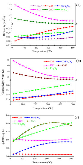 Regarding the thermal diffusion coefficient and thermal conductivity of those typical materials, it can be observed from Figure 5a,b that the two parameters of ZnS, ZnFe2O4, and Fe3O4 were lower than those of KCl and CaO, with the value below 0.5 and 1.0 respectively in the temperature range of 25–500 °C. This finding denoted that those materials including ZnS, ZnFe2O4 and Fe3O4 were of this type material whose thermal diffusion coefficient and thermal conductivity were relatively poor and showed a slight increase trend with a temperature increasing. There was absent of significant influence for temperature on the thermal conductivity properties. The changing trend of the thermal diffusion coefficient of ZnO was similar to that. However, the temperature of ZnO can increase faster with the increase of the interface temperature under high-temperature conditions. Meanwhile, it can be found that the temperature guiding efficiency of ZnFe2O4 was obviously lower, similar to that of heat preservation materials. Moreover, the thermal diffusion coefficient and thermal conductivity of KCl and CaO were relatively high at low temperatures, decreased sharply with a temperature rising, and became stable at a temperature higher than 400 °C. Furthermore, for the specific heat of the typical materials, it was observed from Figure 5c that in the measurement temperature range, the specific heat of CaO was the highest, followed by Fe3O4, KCl, ZnFe2O4, and ZnS. The changes of the specific heat of materials with the temperature increasing varied. Specifically, the specific heat of CaO first increased and then decreased with a temperature rising, and reached the maximum value at about 350 °C; the specific heat of Fe3O4 increased linearly with the increase of temperature; the specific heat of KCl first decreased and then increased with a temperature rising. However, the changing trend is not obvious; the specific heat of ZnFe2O4 first increased and then tended to be flat with the increase of temperature. The specific heat of ZnS did not change with the temperature changing, and was relatively low, indicating that the heat absorption capacity of ZnS is unaffected by temperature. In summary, CaO phase with excellent thermal conductivity properties can remedy the insufficient heating efficient caused by ZnS, ZnFe2O4, and Fe3O4 with poor thermal conductivity properties, further to improve the heating efficient during heating process.