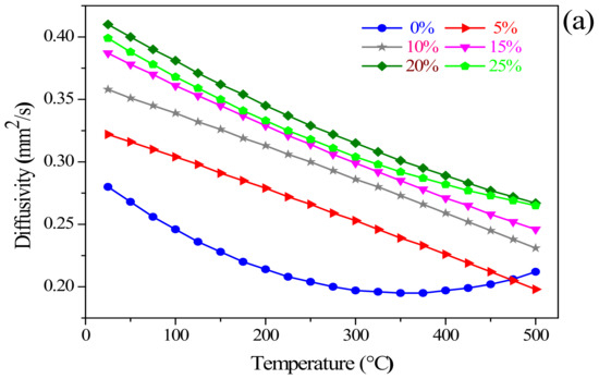 Based on the thermodynamic characteristics analysis of calcification pretreatment for zinc-containing residues, the thermal conductivity properties of the residues added with 0%, 5%, 10%, 15%, 20% and 25% CaO were measured in the temperature range of 25–500 °C. The parameters related to the apparent density of the residues with different CaO addition amounts are displayed in Table 4. Besides, the change of the thermal diffusion coefficient, thermal conductivity, and specific heat of these typical materials in zinc-containing residues at different temperatures were investigated. The respective result is plotted in Figure 6a–c, respectively.