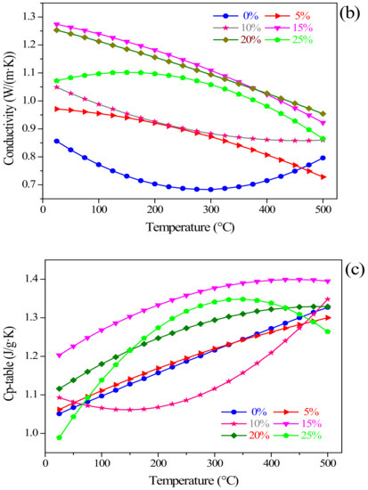 Regarding the thermal diffusion coefficient and thermal conductivity, it can be found from Figure 6a,b that the two parameters of the zinc-containing residues without CaO additives added first decreased and then increased with a temperature rising. However, after adding different amounts of CaO, the overall changing trend of the two parameters with different temperatures can be viewed as a decreasing trend with the temperature increasing. As illustrated in Figure 6b, the thermal conductivities of the residues added with 10% and 25% CaO were significantly affected by temperature. The thermal conductivity of the residues added with 10% CaO decreased rapidly with the temperature rising; however, the residues added with 25% CaO was just the opposite, showing a slower decreasing trend, which indicated that the residues added with 25% CaO endowed excellent thermal conductivity properties at a relatively low temperature. Under certain temperature conditions, the thermal diffusivity coefficient and thermal conductivity of zinc-containing residues increased first and then decreased with the increase of CaO addition. Besides, for the specific heat of the residues with different CaO additions, it was observed from Figure 6c that within the measurement temperature range, there was absent of obvious law with respect to temperature. Specifically, the specific heat of the residues added with 10% CaO first decreased and then increased with a temperature increasing; the specific heat of the residues added with 25% CaO increased first and then decreased with the temperature rising, and reached the maximum value of 1.348 J/g·K at 350 °C; additionally, the specific heat properties of the residues added with another CaO content improved with a temperature increasing and stabilized at temperatures exceeding 400 °C.