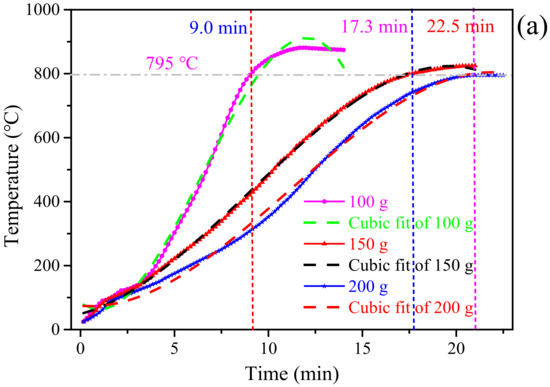 The heating behavior of zinc-containing residues in the microwave field is closely related to the amount of material [42]. Under a microwave output power of 900 W, the influence of the residues amount on the heating behavior was depicted in Figure 7a. The empirical relationships between the temperature (Tm) and time for the residues with a tested mass of 100 g, 150 g and 200 g were shown in Equations (1)–(3), respectively: