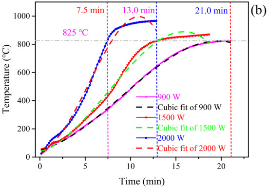 Figure 7b illustrated the heating curves of the residues with a mass of 150 g under different microwave powers. The empirical relationship between the temperature (Tm) and time for the residues under microwave powers of 900, 1500 and 2000 W was presented in Equations (4)–(6), respectively: