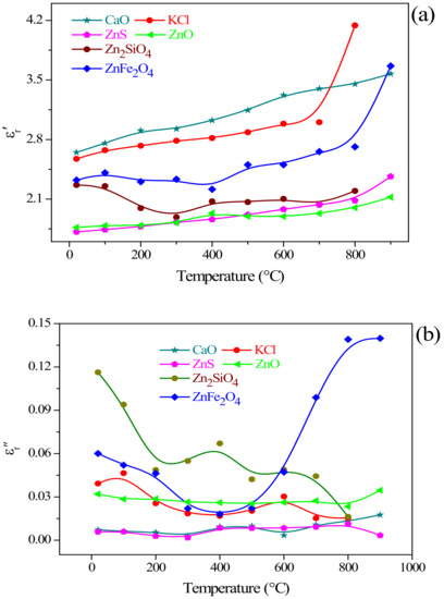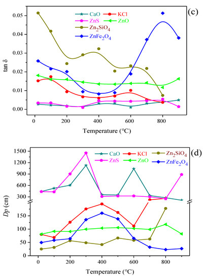 For the dielectric loss factor (εr″), loss tangent coefficient (tan δ), it can be found from Figure 8b,c that the dielectric loss and loss tangent values of ZnO, ZnS, and CaO remained unchanged, while the change patterns of ZnFe2O4, Zn2SiO4, and KCl were quite different. The dielectric loss and loss tangent value of Zn2SiO4 greatly decreased with a temperature increasing. Meanwhile, in the range of 25–400 °C, the dielectric loss and loss tangent value of ZnFe2O4 also decreased with increasing temperature; at temperature higher than 400 °C, the two parameters values of ZnFe2O4 continued to increase with a temperature increasing. In general, the dielectric properties of ZnFe2O4 were significantly affected by the temperature. The decrease in dielectric loss and loss tangent value with the increase of temperature indicates that the material is easy to obtain better uniformity of microwave heating during the microwave heating process.