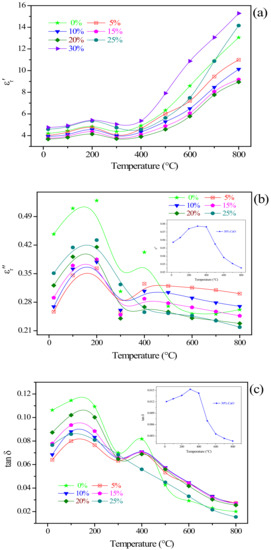 Figure 9b,c described the change of dielectric loss and loss tangent of zinc-containing residues added with 0–30% CaO with different temperatures, respectively. As presented in Figure 9b, the dielectric loss of zinc-containing residues added with 0–20% CaO can be divided into three stages by temperature: (1) The first stage at 25–300 °C, there is a trend of increasing first and then decreasing. This stage can be attributed to the homogenized heat transfer process of the zinc-containing residues that absorbs microwaves and converts microwaves into heat energy. (2) The second stage at 300–500 °C, there is also a tendency to increase first and then decrease. This change indicated the phase structure may change during the microwave heating process. Based on the above thermodynamic characteristics analysis, at a temperature higher than 400 °C, ZnFe2O4 and Zn2SiO4 react with CaO and transform into a large amount of ZnO. As shown in Figure 8a, ZnO is a weakly microwave-absorbing substance, and the dielectric constant value of ZnO is significantly lower than that of ZnFe2O4 and Zn2SiO4. The large amount of new generated ZnO phase reduced the ability of the whole residues to absorb microwaves and convert them into heat. Therefore, the dielectric loss of the material also increased with the temperature as the reaction proceeds. (3) The third stage at a temperature higher than 500 °C, the dielectric loss of the residues tended to be stable, indicating that there was absent of obvious thermal conversion of microwave energy at this stage, that is, the phase transformation of refractory mineral phase arose at the temperature range of 300–500 °C. It is worth noting that, the change in the dielectric loss of zinc-containing residues added with 25% CaO included only two stages, and it tended to balance around 400 °C. The decrease in the equilibrium temperature may be attributed to the increase in CaO content makes the phase inversion reaction is more rapid at the same temperature. Besides, the dielectric loss of the residues added with 30% CaO was significantly lower than other residues with other CaO additions. The temperature change showed no significant effect on the dielectric loss.