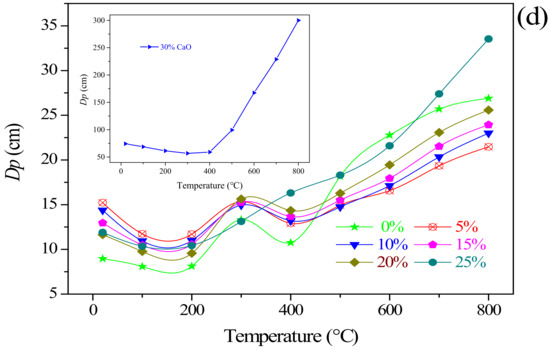 For the loss tangent coefficient, it was found from Figure 9c that in the range of 25–400 °C, the changing trend of the loss tangent coefficient of the residues with different CaO contents was similar to the dielectric loss changes with the temperature. At a temperature exceeding 400 °C, the loss tangent coefficient decreased sharply with the increase of temperature. This phenomenon is assigned to the dielectric loss remained unchanged within this temperature range, while the dielectric constant rose sharply; therefore, the ratio of the dielectric loss to the dielectric constant (i.e., the loss tangent coefficient) showed a decreasing trend with the temperature increasing. For the microwave penetration depth, it can be concluded from Figure 9d that in the range of 25–800 °C, there was a significant difference in the microwave penetration depth of the residues with 0–25% CaO and 30% CaO. The penetration depth of the residues added with 0–25% CaO was between 7–35 cm and increased with the temperature rising. However, for the residues added with 0–20% CaO, there arose two troughs in the range of 25 °C–500 °C. This finding denoted that adding 5–20% CaO and no adding CaO had the same effect on the microwave penetration depth; meanwhile, the microwave penetration ability was strengthened with the addition of CaO content; moreover, under the condition that the thickness of the baked material without exceeding the microwave penetration depth, the high microwave penetration depth is the prerequisite to ensure the uniformity of microwave heating. Furthermore, the microwave penetration depth of the residues added with 25% CaO did not decrease with the increase of temperature in the range of 300–500 °C, conversely promoted the microwave penetration depth increased, which indicated that adding 25% CaO within the range of 300 °C–500 °C presented a positive effect on improving the uniformity of microwave heating. However, it was found from Figure 9d that in the range of 25–400 °C, the microwave penetration depth of the residues added with 30% CaO did not increase with the increase of temperature, the microwave penetration depth was maintained in the range of 50–75 cm; at a temperature higher than 400 °C, the increase in temperature showed a significant effect on the microwave penetration depth. The penetration depth of microwaves can reach 300 cm at 800 °C. Combining with the analysis of Figure 9b,c, it can be summarized that the dielectric loss and loss tangent coefficient of the residues added with 30% CaO significantly reduced, indicating the utilization rate of microwave energy on minerals was significantly reduced. The time required to reach the required temperature under the same conditions will be correspondingly extended. Therefore, it was summed that the amount of CaO additive should not be higher than 30% for the effective use of microwave energy for microwave mineral activation pretreatment. The favorable CaO addition amount was determined as 25%.